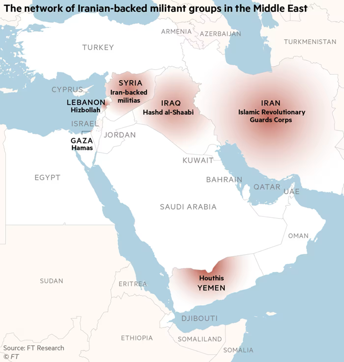 Entretanto, ¿cómo podría extenderse la guerra en Medio Oriente hasta llegar a una gran guerra regional o a una mundial (si se conecta con la de Ucrania)? La clave está en el comportamiento de Israel e Irán con sus desbordes y en el próximo caos político de los EEUU. Basta ojear el mapa del llamado “eje de resistencia”[4] para sacar una grave conclusión: